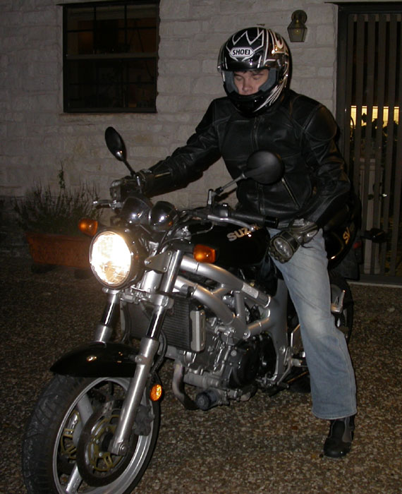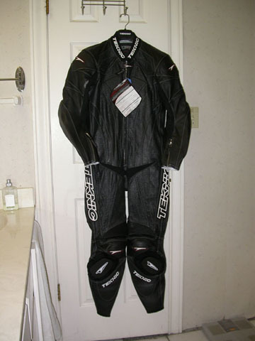 | Nicholas' new cycling leathers. Required for riding on a cycling
