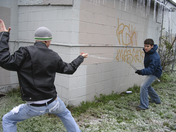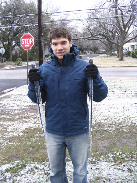 | Llewyn and Steven in front of the UT tower ice sculpture. |